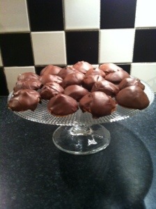 Smält 200 gr 70% mörk choklad och doppa biskvierna så att chokladen täcker hela kakan.