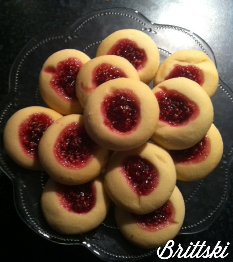 Dela degen i 30 bitar och rulla till bollar. Gör en fördjupning i varje kaka med fingret. Fyll den med hallonsylt
