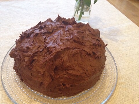 Montera kakan med mycket kräm mellan bottnarna och ett fluffigt lager runt om hela tårtan.