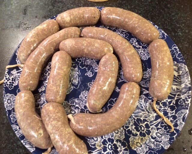 Knyt en knut när du fyllt korven och snurra till lika stora delar, lättast blir det med steksnören.