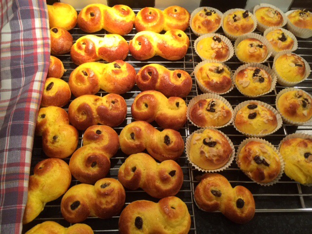 Dela degen i bitar och rulla lussekatter eller kavla ut en kaka lägg på flytande margarin och mandelmassa, gör en rulle och lägg i bullformar.