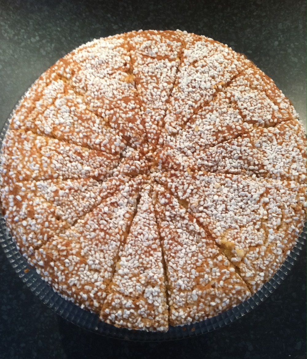 Klä en springform 24 cm med bakplåtspapper, häll i smeten och strö pärlsocker
