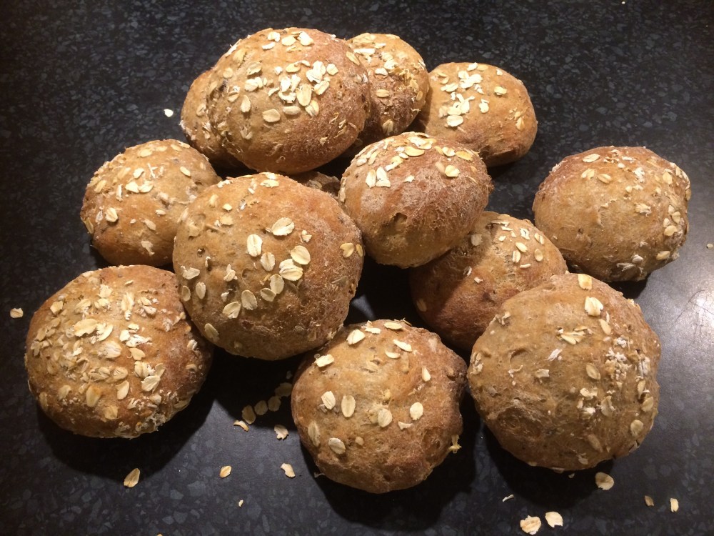 Forma till bullar med hjälp av lite extra havremjöl på händerna. Lägg på en bakplåtsklädd plåt. Toppa bullarna med havregryn.