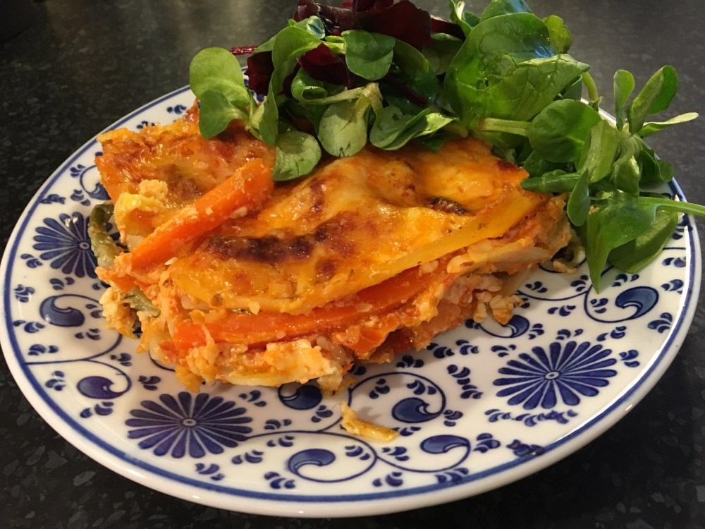 Smörj en ugnsform och varva sedan tomatsås, grönsaksröra och lasagneplattor.