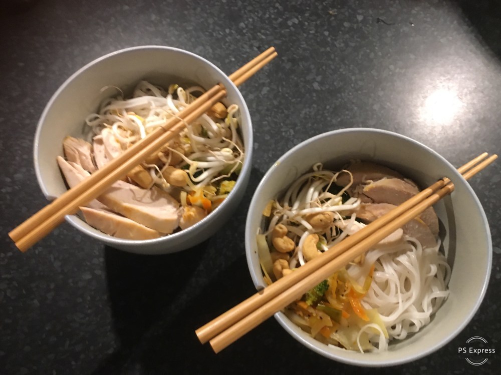 Skär kycklingen i tunna skivor. Lägg upp i skålar. Börja med nudlarna.