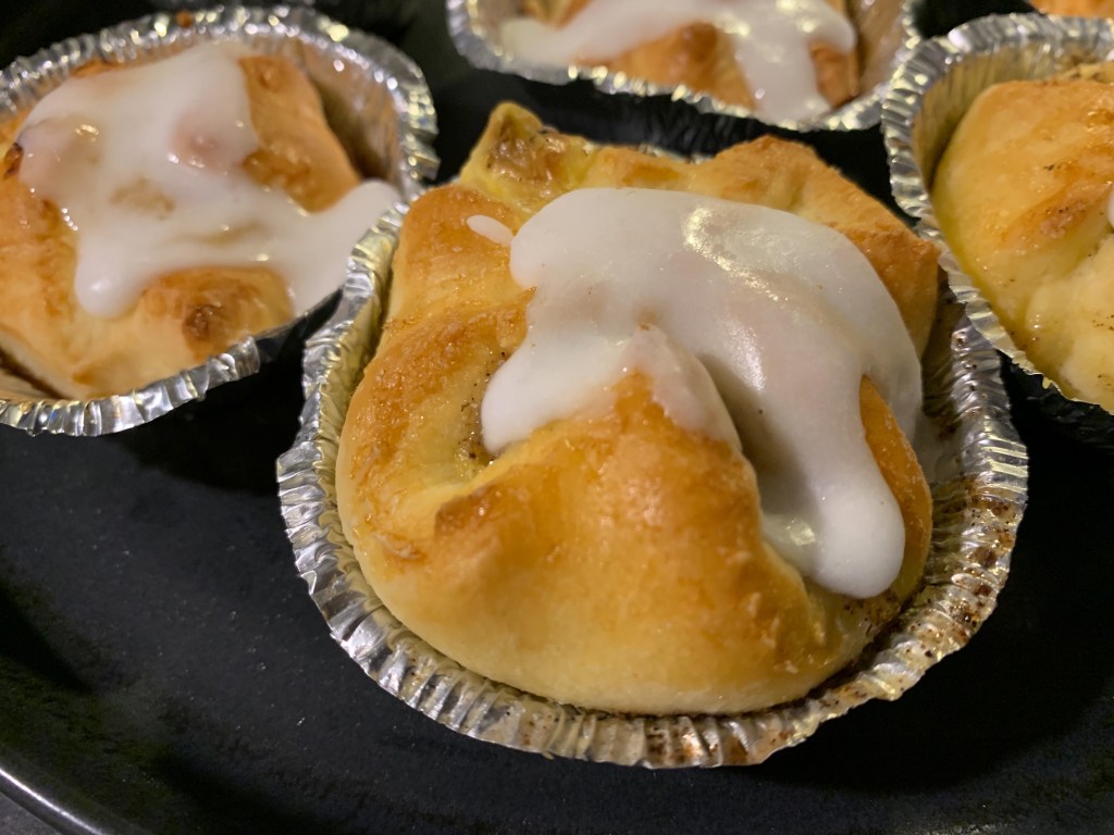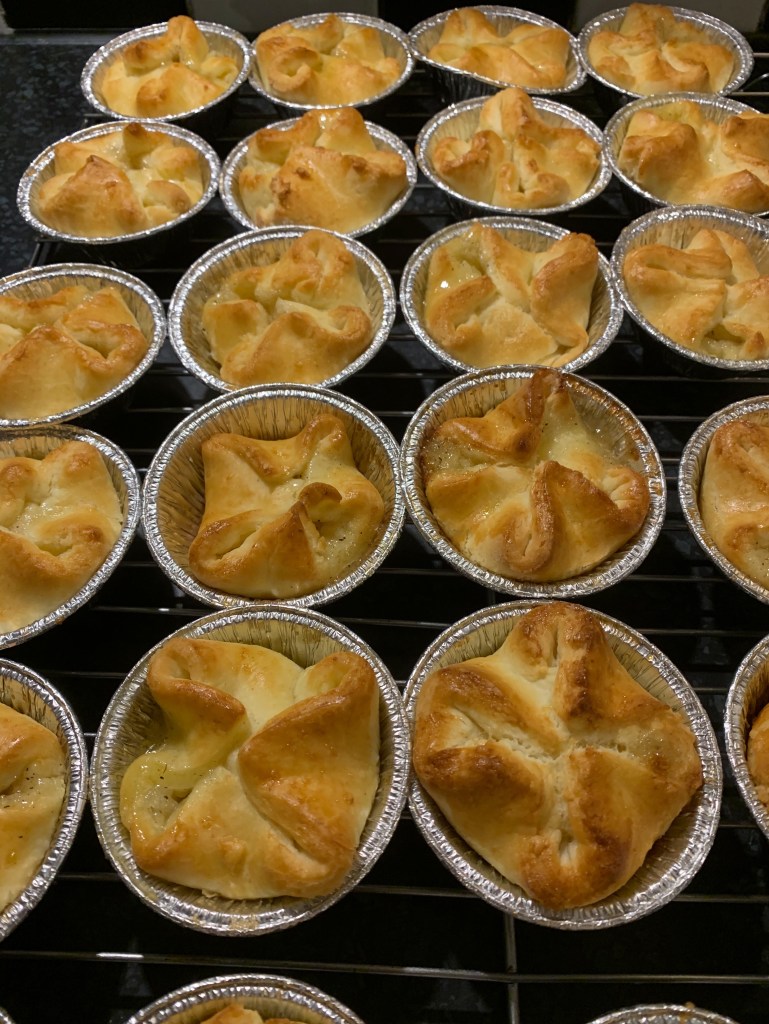 Rör ihop ingredienserna till fyllningen och fördela på degplattorna, vik sedan ihop de fyra hörnen mot mitten och lägg över i aluminiumformar. Låt jäsa på dragfritt ställe under bakduk i 2 timmar. Pensla med lätt uppvispat ägg, grädda mitt i ugnen i 5-7 min, 250 grader.