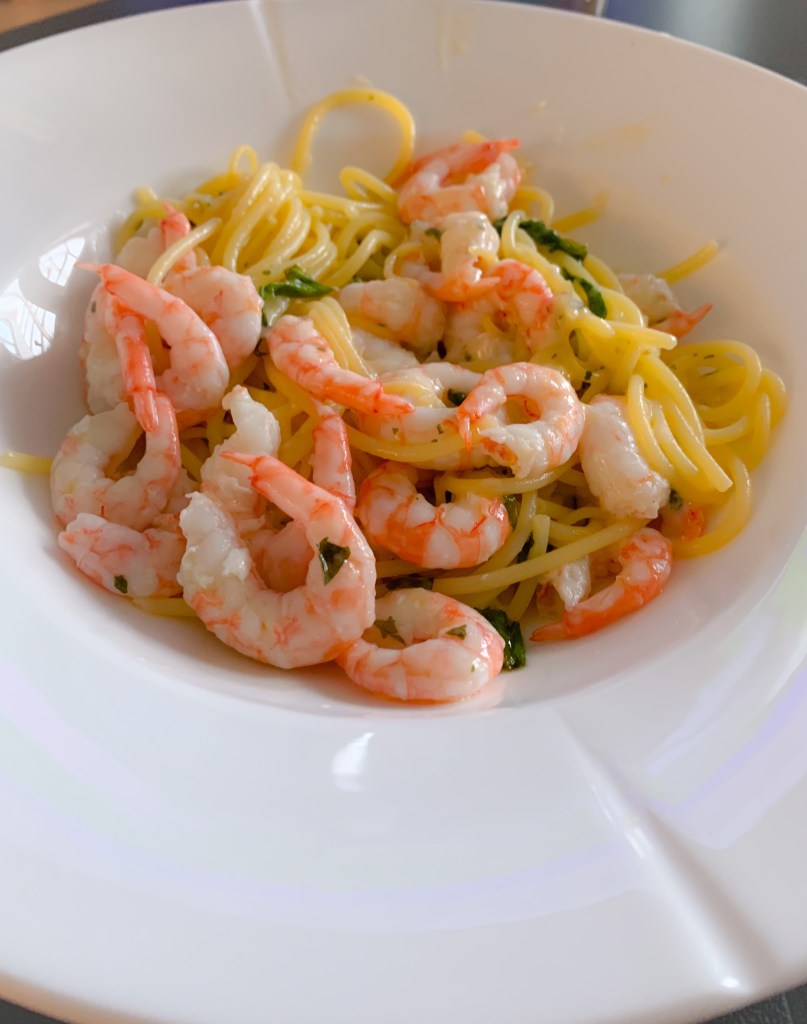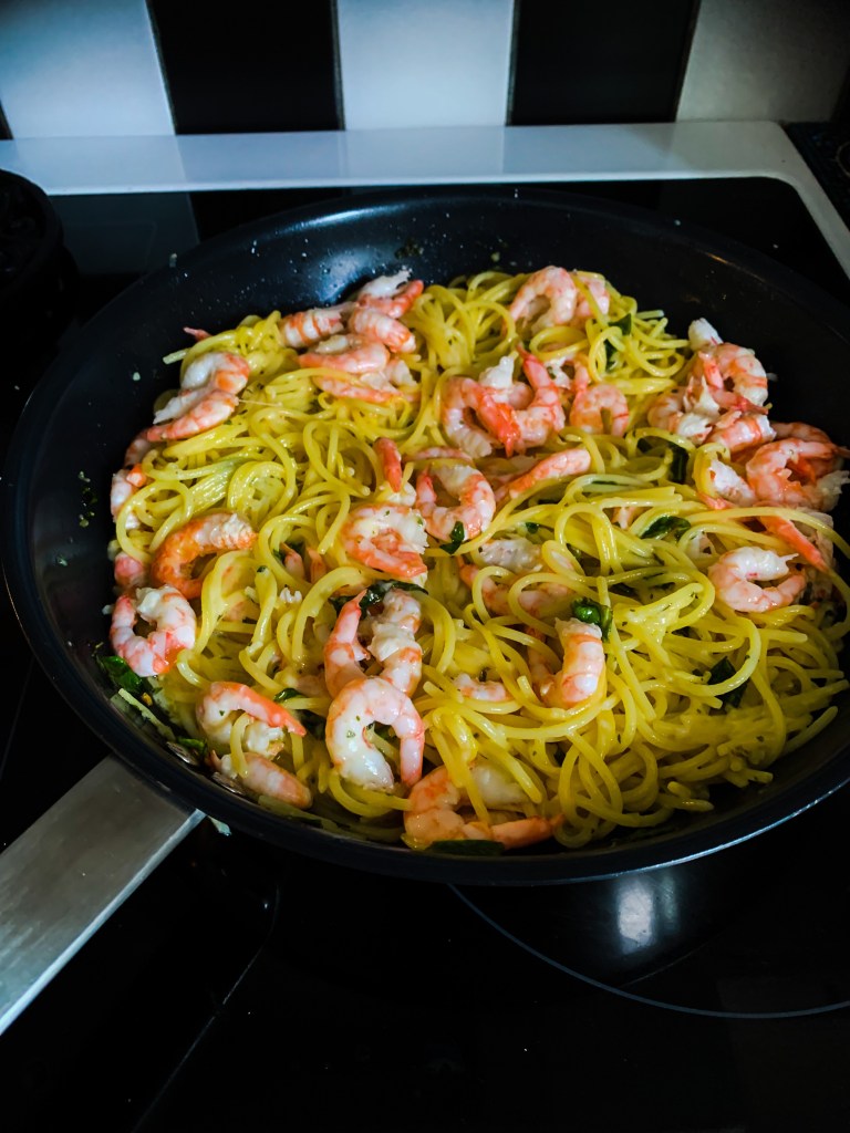 Vänd ned spagettin i stekpannan med vitlök och kryddor, strö över parmesanost och sist de skalade räkorna.